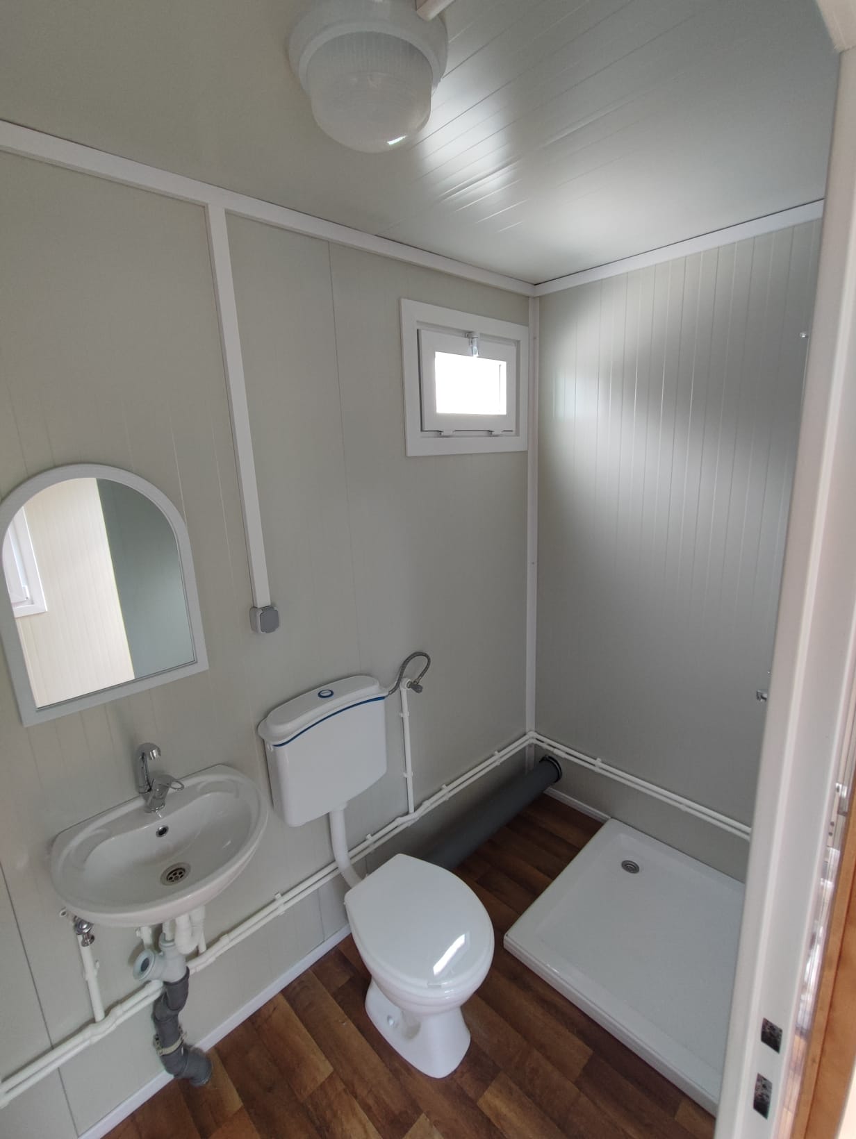 1. Bad mit modernster Ausstattung: Genießen Sie die Bequemlichkeit eines eigenen Badezimmers direkt in Ihrem Bürocontainer. Hochwertige sanitäre Einrichtungen bieten Komfort und sparen Ihnen den Weg zu externen Einrichtungen.