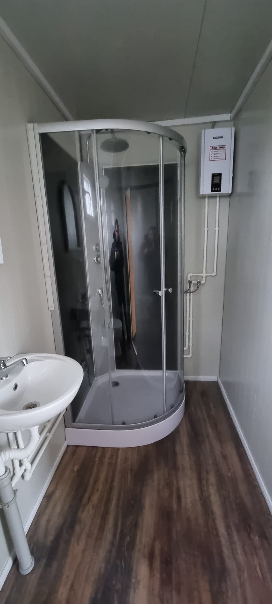 Komplettes Badezimmer: Genießen Sie den Luxus eines voll ausgestatteten Badezimmers direkt in Ihrem Wohncontainer. Die moderne Einrichtung umfasst eine elegante Duschkabine, hochwertige Sanitäranlagen und stilvolle Armaturen, die ein Höchstmaß an Komfort und Funktionalität bieten.